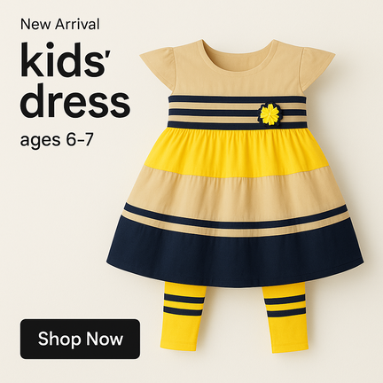 This adorable 2-piece dress set features bold navy, beige, and yellow stripes with matching leggings and a flower detail. Perfect for everyday wear or a party look.