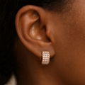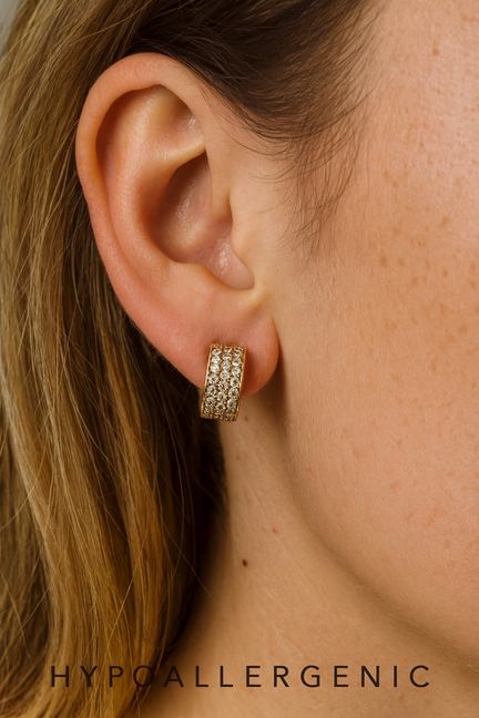 Løft dit look med vores Crystal Glow Hoops. Disse guldbelagte, hypoallergeniske øreringe har rækker af funklende zirkonia, som giver det perfekte hverdagsglimt. Letvægtige og skånsomme mod følsomme ører – kombinerer komfort og luksus, perfekte både til hverdag og fest.